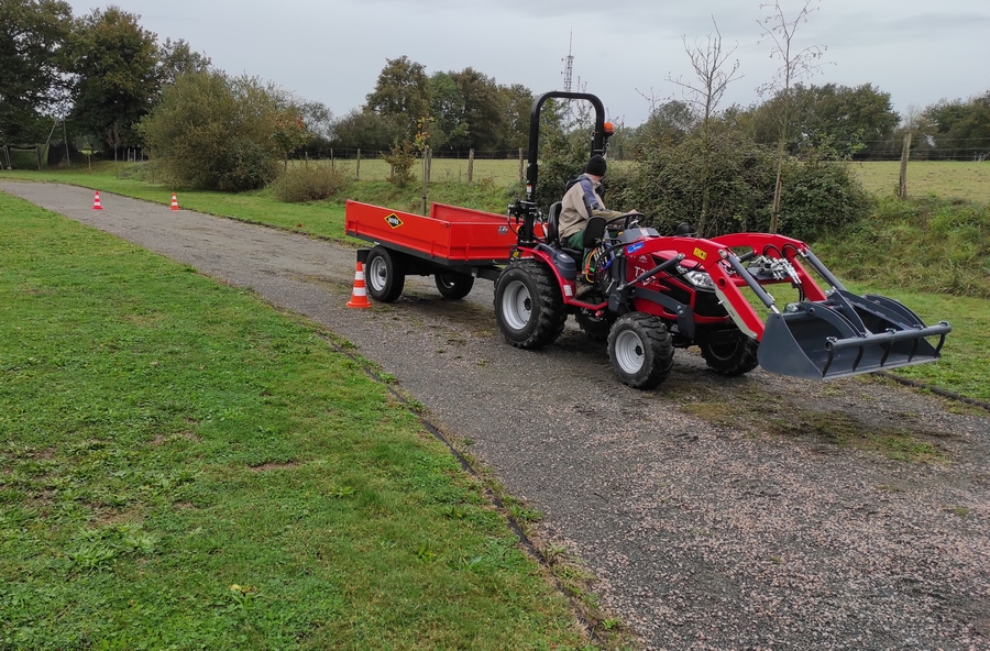 Utiliser le matériel en sécurité et de façon adapté : Présentation du matériel utilisé : Microtracteur 25cv – Consignes de sécurité liées à l’utilisation – Mise en service du matériel (auto-contrôles). Conduite et manœuvre du matériel : Prise en main, maitrise de la marche avant et de la marche arrière – Manœuvres en marche arrière avec une benne – Attelage et dételage d’un outil 3 points – Utilisation d’un outil (fraise rotative/broyeur) en sécurité.