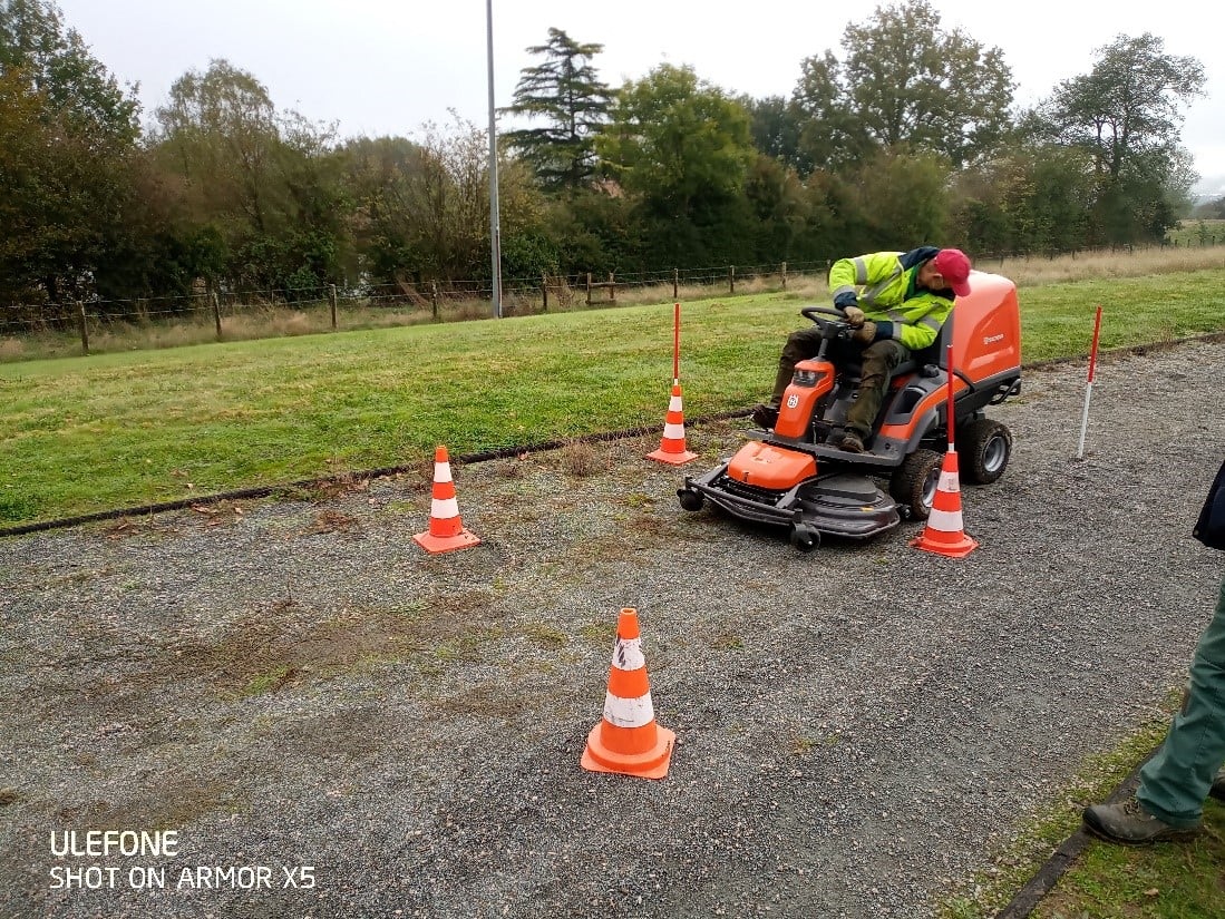 Utiliser le matériel en sécurité et de façon adapté : Présentation des matériels utilisés : tondeuse autoportée – Consignes de sécurité liées à l’utilisation – Mise en service du matériel (auto-contrôles). Conduite et manœuvre du matériel : Prise en main, maitrise de la marche avant et de la marche arrière – Manœuvres de franchissement de passages difficiles sans contact – Réguler le régime moteur selon la situation (éco-conduite).